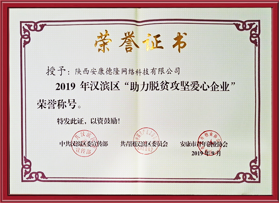 2019年漢濱區(qū)“助力脫貧攻堅(jiān)愛(ài)心企業(yè)”榮譽(yù)稱(chēng)呼
